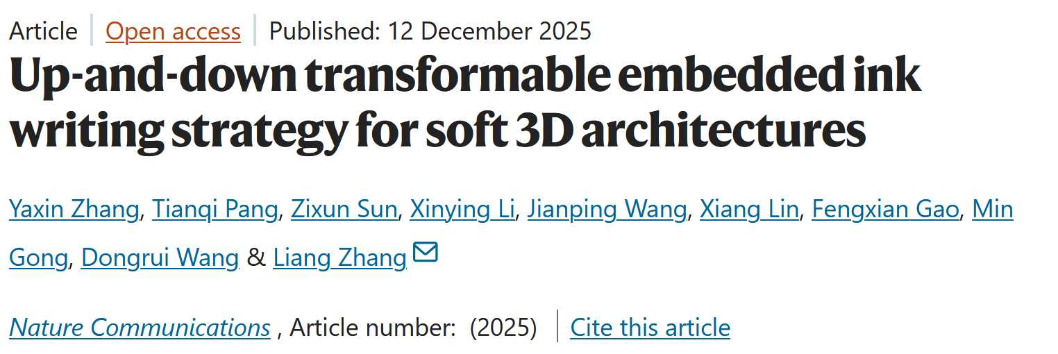 成人视频 成人视频 张靓副教授最新研究成果——沉浮式墨水直写3D成型技术,以“Up-and-Down Transformable Embedded Ink Writing Strategy for Soft 3D Architectures”为题发表于国际顶级期刊《Nature Communications》。成人视频 为该论文的唯一通讯单位,第一作者为成人视频 22级博士生张娅欣。