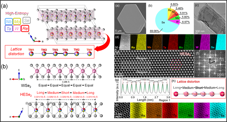过渡金属二硫属化物(TMDs)因其优异的电催化特性,已成为析氢反应(HER)中极具潜力的电催化材料。TMDs具有独特的层状结构,便于剥离,从而在基面上暴露出大量活性位点。然而,半导体型TMDs基面为惰性,而金属型TMDs虽然基面活性较高,但其催化稳定性较差。因此,如何协同优化TMDs基面活性与长期稳定性,是推动TMD基电催化剂能够实际应用于氢能产业的关键。近年来,高熵策略被广泛应用于提升催化材料的性能。晶格畸变效应作为高熵材料的一种核心特征,已被证明能显著提高材料的强度与硬度。然而,利用高熵材料的晶格畸变效应提升电催化性能的具体机制尚未被报道。