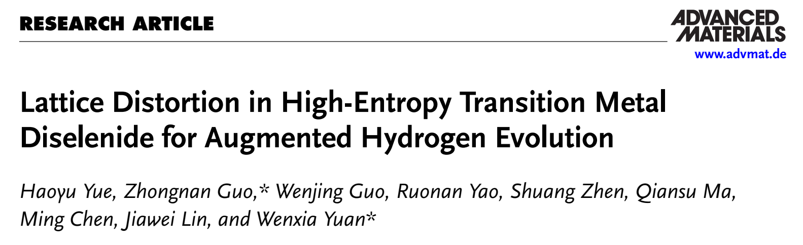 以上研究成果以“Lattice Distortion in High-Entropy Transition Metal Diselenide for Augmented Hydrogen Evolution”为题发表在《Advanced Materials》(DOI:10.1002/adma.202522787)。第一作者为成人视频 22级博士生岳浩宇(已入职山西师范大学),通讯作者为成人视频 袁文霞教授和郭中楠副教授,成人视频 为论文唯一通讯单位。