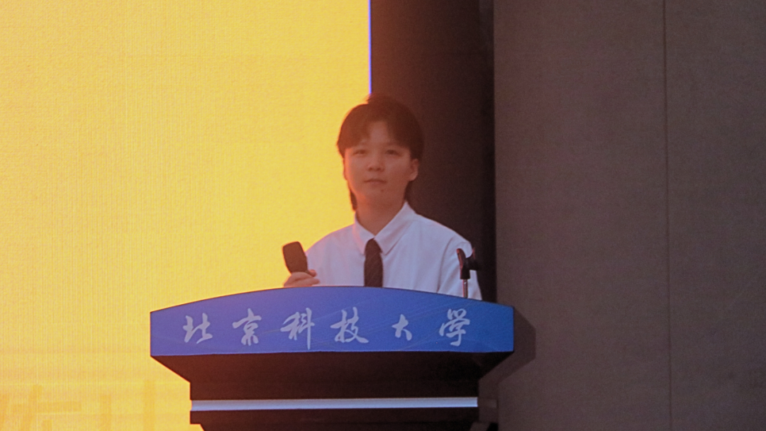2024级研究生陈倚同学作为在校生代表发言,陈倚同学分享了自己在北科的求学经历和感悟,鼓励新生保持勇敢、勇于创新,以创新为笔书写突破,以勇敢为翼让梦想落地生根。